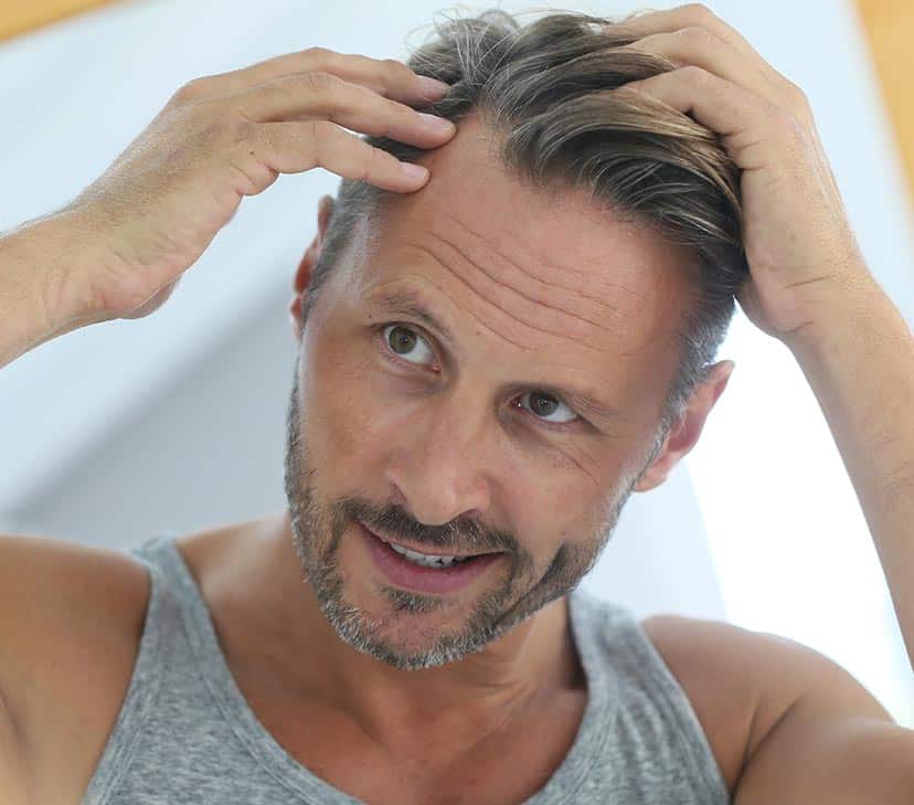 In men most hair loss can be attributed to something called male pattern baldness where hair follicles on the top and forehead on the scalp are susceptible to the hormone dihydrotestosterone, (DHT). Acting over time, DHT causes shrinking and then death of hair follicles that are susceptible to DHT.